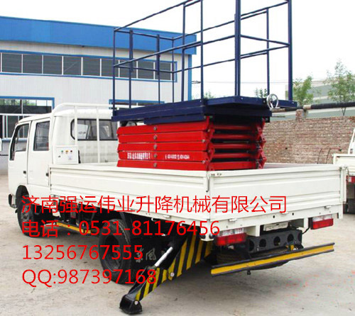 產(chǎn)品規(guī)格:本類產(chǎn)品根據(jù)升降高度可分為4、6、8、10米升降平臺,設(shè)備載重300公斤至500公斤,客戶可根據(jù)需求選用解放、東風(fēng)、輕騎、福田、電瓶車等任何車型,設(shè)備直接采用汽車或電瓶的直接動力升降。